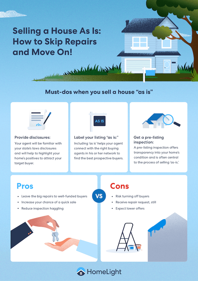 If you don’t have a stash of cash or spare time to dedicate to renovations, or if you simply don’t want the hassle of drawn-out negotiations, you might decide to sell your home as-is. Just remember these key takeaways: